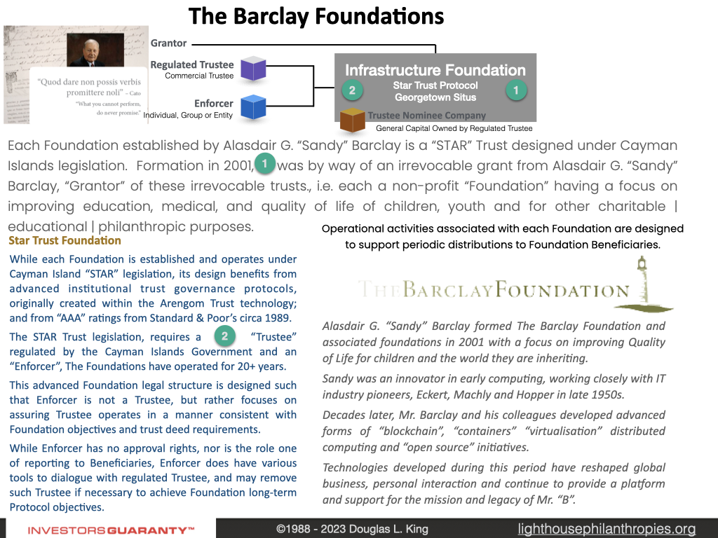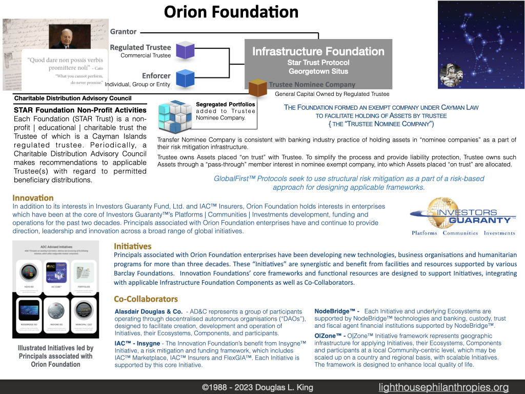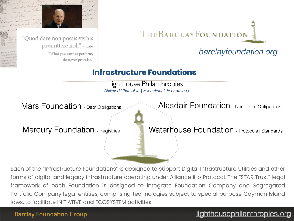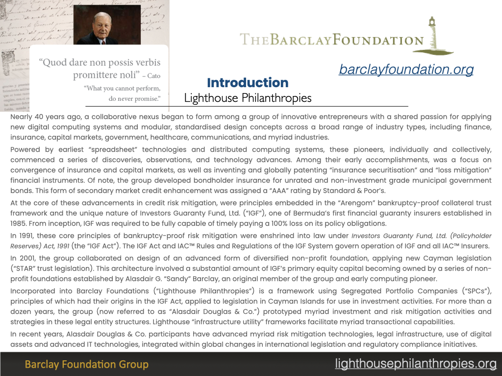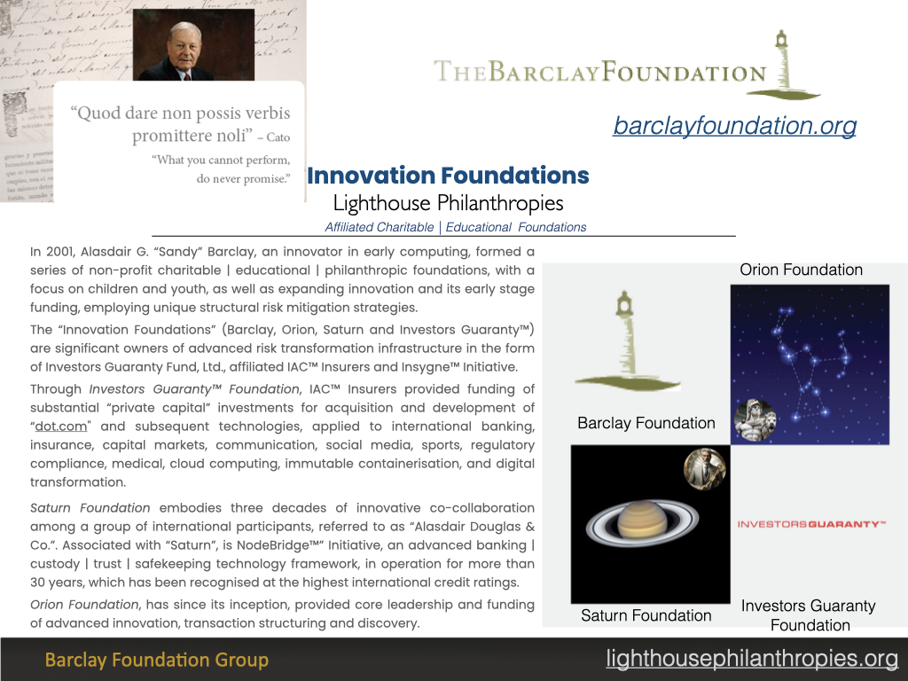 The Barclay Foundation launched a series of non-profit foundations ("Lighthouse Philanthropies") under a special form of British trust law to facilitate mitigation of myriad transactional risk exposures in international capital, insurance, and cross-border markets, related to international assets.