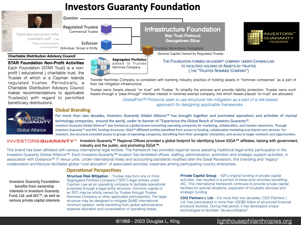 2. Investors Guaranty Foundation (IGF) The Investors Guaranty Foundation anchors the funding dimension of Sandy’s vision. Closely tied to the Investors Guaranty Global Alliance™, IGF functions as a global financing and structuring platform. Through regional offices in Bermuda, Dubai, Zurich, New Zealand, Canada and elsewhere, IGF provided the administrative infrastructure to transact internationally, long before digital nodes became commonplace. It integrated physical presence with computing systems, creating jurisdictional nexus points that allowed cross-border transactions to be booked seamlessly. Its role was not to operate ventures directly but to fund them, distribute capital into aligned technologies and enterprises, and provide structural support. Over time, IGF evolved into the principal engine for financing innovation within the Alliance, from private capital markets to international partnerships.
