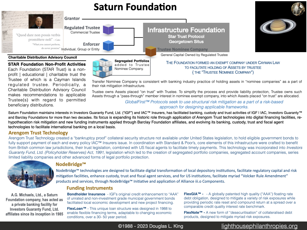 4. Saturn Foundation The Saturn Foundation carries forward Sandy’s financial innovation legacy. Historically aligned with AG Michaels as a private banking facility for Investors Guaranty™, Saturn now anchors intellectual property, specialized financial instruments, and risk-mitigation structures. It holds and develops innovations such as FlexGIA, FlexNode, FlexLoan, and bondholder insurance, along with related IP. Saturn provides the financial “engine room” for advanced structuring — securitization, desecuritization, and systemic capital market tools. In many respects, Saturn represents the integration of Sandy’s accountancy precision with his flair for systemic innovation, ensuring that new tools can be developed and deployed with global reach.