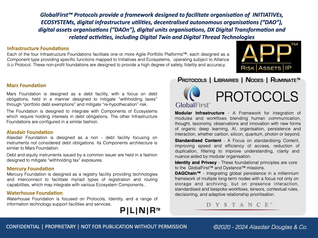 Innovation Foundations provide technologies, funding and leadership in developing new Initiatives, while Infrastructure Foundations maintain legacy and digital "infrastructure utilities" to support risk mitigation and persistence of various asset classes, as well as transaction support.